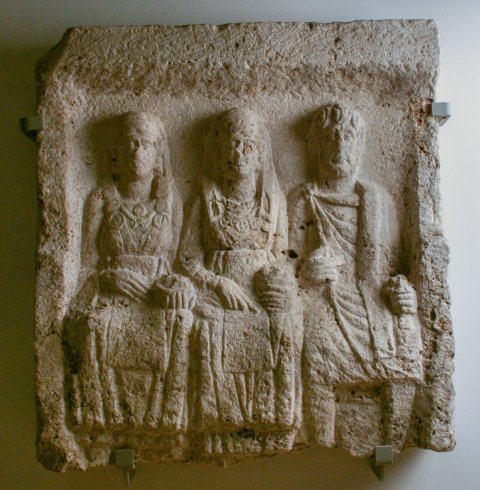 - Familie. In Rechtecknische auf Bank mit Lehnen drei sitzende Ganzfiguren. Links einheimische Frau: Haube, Schleier, Ober- und Untergewand, Gürtel mit Schürze, Fibeln mit Ringen, Brustschmuck mit Lunula, Brosche, in der Linken Korb mit Früchten. In der Mitte einheimische Frau: Haube, Schleier, Ober- und Untergewand, Gürtel mit Schürze, Flügelfibeln, Ohrgehänge, Brustschmuck mit drei Scheiben, in der Linken Korb mit Füchten. Rechts Mann: bärtig, Locken, Sagum, Fibel, Hosen, in der Linken Rolle (volumen).