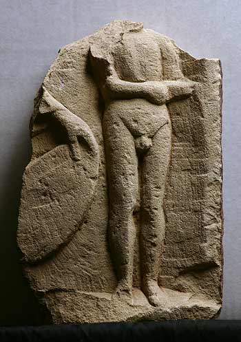 - Nackte stehende Figur, links daneben ein Schild(?), der von einer Hand gehalten wird.