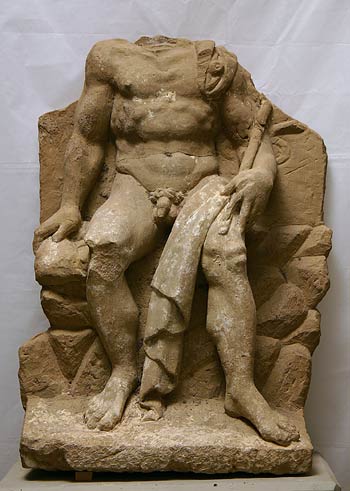 - Mythische Figur : Der bis auf die Chlamys nackte Mercur sitzt auf einem Felsen und hält in der Linken den caduceus (Heroldstab). Das teilweise vollplastisch ausgearbeitete Relief gehörte zur Skulpturenausstattung eines Mithräums.