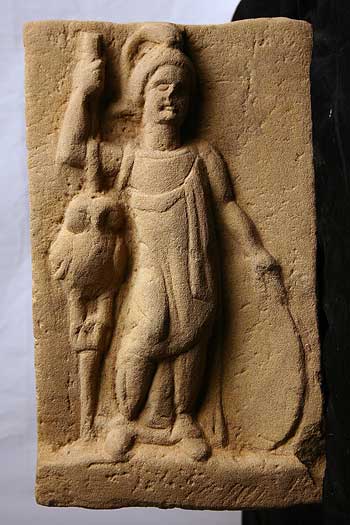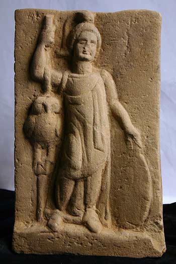 - Mythische Figur: Minerva, bekleidet mit Chiton und Himation, trägt einen antikisierenden, in seinem Typus nicht deutlich wiedergegebenen Helm mit Helmbusch. Die bis in Kopfhöhe erhobene Rechte hält eine Lanze, die Linke ergreift den oberen Rand eines großen Rundschildes, der auf dem Boden steht. Auf einem in den Boden gerammten Pfahl zu ihrer Rechten sitzt eine große Eule.