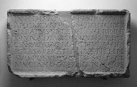 - In h(onorem) d(omus) d(ivinae) Apo[lli]ni et Sironae / aedem cum signis C(aius) Longinius / Speratus vet(eranus) leg(ionis) XXII Pr(imigeniae) p(iae) f(idelis) / et Iunia Deva coniunx et Lon/gini(i) Pacatus Martinula Hila/ritas Speratinus fili(i) in / suo posuerunt v(otum) s(olverunt) l(ibentes) l(aeti) m(erito) / Muciano et Fabiano co(n)s(ulibus)