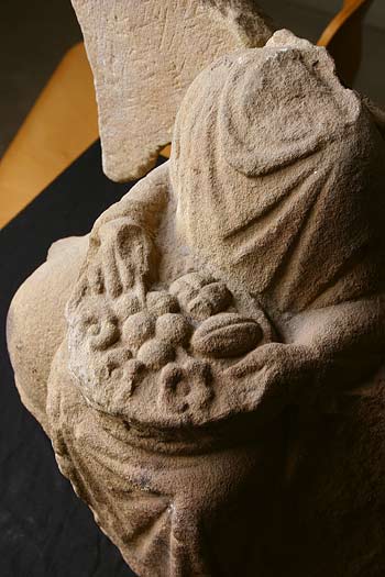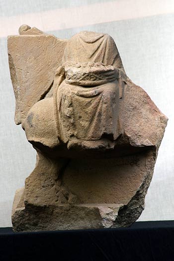 - stark beschädigt. Kopf der Göttin und des Pferdes, der vordere Teil des Pferderumpfs und drei Beine des Tiers abgeschlagen