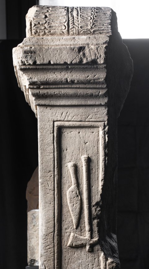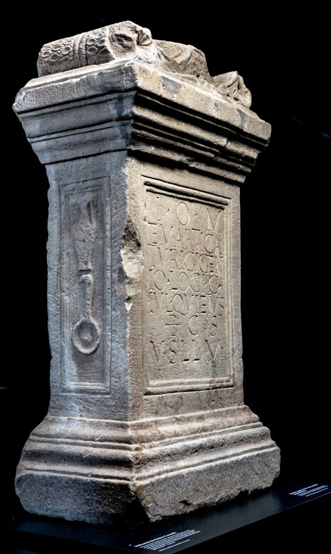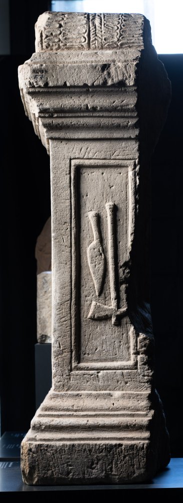 - Mehrfach abgetreppte Basis und entsprechend vorkragendes Gesims. Hoher Focus mit trapezförmiger Focusschranke und rundbogigen Übergängen zu den seitlichen Pulvini, die vorn ein eingetieftes sternförmiges Ornament tragen, oben mit einem Muster unterschiedlicher Blätter verziert sind und in der Mitte mit einer doppelten Schnur zusammmengezogen werden. Auf der linken Nebenseite sind Kanne und (darunter) Griffschale dargestellt; rechts Opfermesser und Opferbeil, jeweils mit dem Griff nach oben. Die Inschriftfläche ist von zweifach profilierten Randleisten eingefaßt.