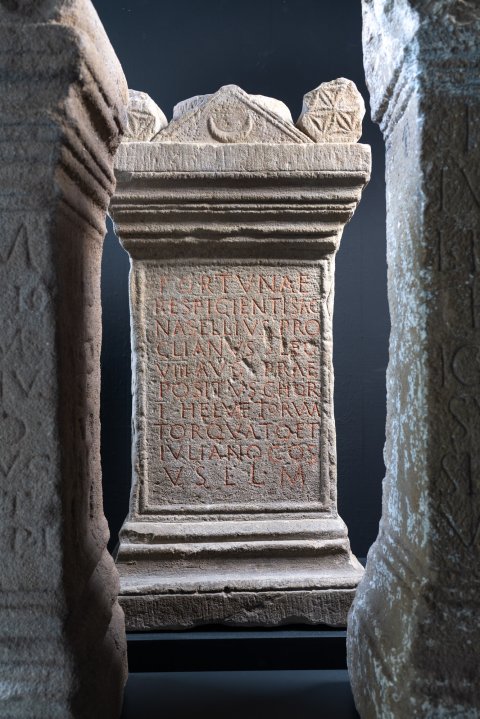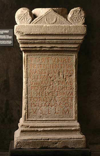 - Fortunae / Respicienti sacr(um) / Nasellius Pro/clianus |(centurio) leg(ionis) / VIII Aug(ustae) prae/positus c(o)hor(tis) / I Helvetiorum / Torquato et / Iuliano / co(n)s(ulibus) / v(otum) s(olvit) l(ibens) l(aetus) m(erito)
