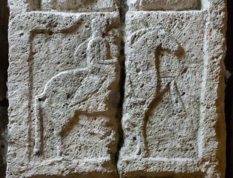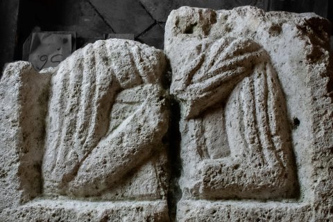 - Im Hauptbild Brustbild eines Mannes mit Tunica und Mantel. Zwischenbild mit Reiter.