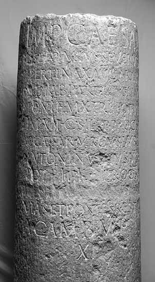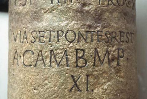 - Imp(erator) Caesar / L(ucius) Septimius Severus Pius / Pertinax Aug(ustus) Arabic(us) / Adiab(enicus) Parthicus maximus / pontif(ex) max(imus) trib(unicia) pot(estate) VIIII / imperator XII co(n)s(ul) II p(ater) p(atriae) proco(n)s(ul) et / Imp(erator) Caesar Marcus Aurel(ius) / Antoninus Pius Aug(ustus) trib(unicia) / pot(estate) IIII proco(n)s(ul) et / [[ P(ublius) Septimius Geta Antoninus ]] / vias et pontes rest(ituerunt) / a Camb(oduno) m(ilia) p(assuum) / XI
