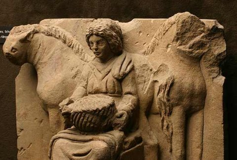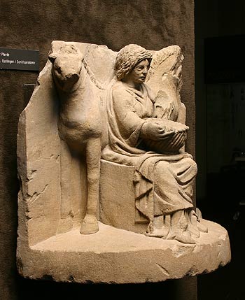 - Mythische Figur : Das Hochrelief hat eine halbrunde Basisplatte. Epona sitzt frontal auf einem gepolsterten Stuhl zwischen zwei Pferden, die von ihr weg jeweils nach außen gewandt sind. Die hintereinander gestaffelten Pferde erscheinen in flacherem Relief, während Epona fast vollplastisch ausgeführt ist. Die Frisur mit den langgewellten Locken und dem Mittelscheitel umrahmt das Gesicht. Epona trägt ein knöchellanges Untergewand, ein fast gleich langes Überkleid mit V-förmigem Ausschnitt und einen schalähnlichen Überwurf, der quer über die Knie liegt und über der linken Schulter nur wenig herabhängt. Der Faltenwurf ist mit relativ wenigen Einkerbungen, aber naturgetreu wiedergegeben. Mit beiden Händen hält sie auf ihrem Schoß einen großen, mit Früchten gefüllten Korb.