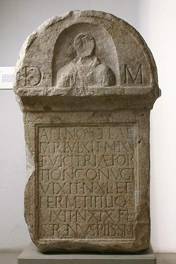 - Grabstein mit gerahmtem und eingetieftem Schriftfeld. Auf dem halbrunden, durch eine vorspringende Leiste abgesetzten Oberteil links und rechts einer Nische: D(is) M(anibus). Der Kopf der Büste in der Nische ist abgeschlagen; die Büste stellt wohl die Grabinhaberin dar, wogegen Haug-Sixt und ihnen folgend Filtzinger in ihr eher den Sohn, und zwar den "zuletzt gestorbenen" erkennen wollen. Die Abfolge "Mutter-Gattin-Sohn" bezieht sich m. E. aber nicht zwangsläufig auf die Reihenfolge der Todeszeitpunkte, sondern stellt eine soziale und persönliche Rangfolge dar.