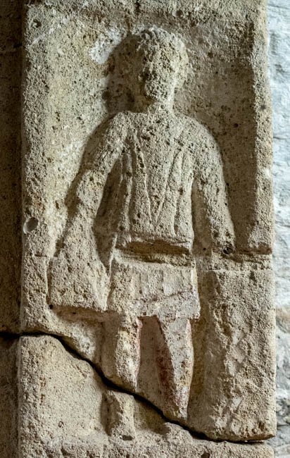 - Diener (Librarius, Scriba ?): bartloser Mann in kurzer Ärmeltunica, in der Rechten Polyptychon mit Henkel (?).