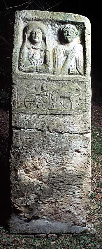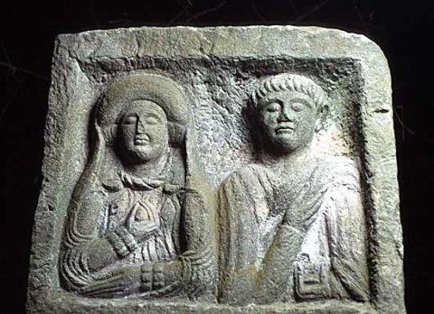 Im Hauptbild in Rechtecknische zwei Brustbilder (Ehepaar). Links einheimische Frau: Haube, Schleier, Flügelfibeln, Torques, Armbänder, in der Rechten Apfel. Rechts Mann: bartlos, gesträhntes Haar, Ärmeltunica, Mantel, in der Linken viereckiger Gegenstand.