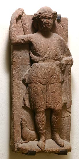 Diana im Hochrelief vor einer flachen Hintergrundplatte; der Kopf ragt z. T. vollplastisch ausgearbeitet über die Platte hinaus. Sie trägt einen knielangen, gegürteten Chiton und einen über ihre linke Schulter nach hinten geworfenen leichten Mantel. Mit der Rechten greift sie nach einem Pfeil im Schulterköcher; die Linke hält den nur undeutlich wiedergegebenen Bogen. Rechts zu ihren Füßen ein zu ihr aufblickender Hund.