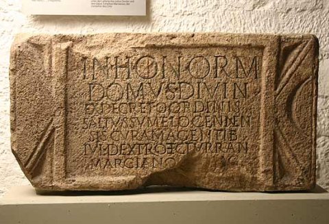 - In honorem / domus divin(ae) / ex decreto ordinis / saltus Sumelocennen/sis curam agentib(us) / Iul(io) Dextro et C(aio)(?) Turran(io) / Marciano mag(istris)(?)