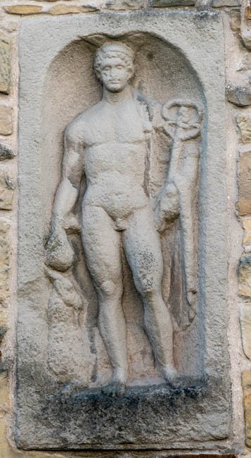 Mercur steht in einer Nische. Er trägt einen runden Hut mit Flügeln. In der linken Hand hält er einen Schlangenstab, in der rechten Hand einen Beutel. Unter dem Beutel liegt ein Bock. Die Chlamys hängt von der linken Schulter.