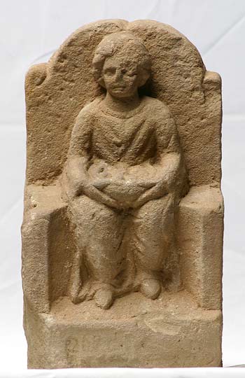 - Mythische Figur : Herecura in Unter- und Obergewand auf einem Thron dargestellt, hält mit beiden Händen einen Früchtekorb im Schoß. Das fast vollplastische Relief ist auf der Bodenleiste vor einem glatten Hintergrund dargestellt. (nach Filtzinger, Hic saxa ...).