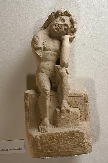 - Ein Jüngling (Trauergenius ?) unbekleidet, mit trauerndem Gesichtsausdruck ist sitzend dargestellt. Er stellt das linke Bein auf einen Schemel und legt die rechte Hand auf das linke Knie; darauf ruht der linke Ellenbogen. Mit der linken Hand stützt er den seitlich geneigten Kopf. Wahrscheinlich war die Figur die Bekrönung eines Grabmals (nach Filtzinger, Hic saxa...).