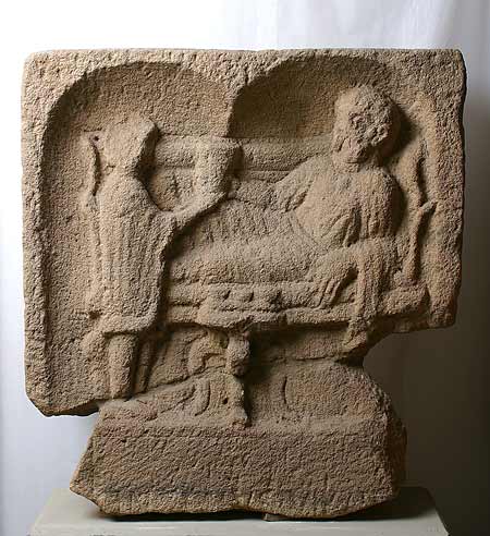 Totenmahl : Ein bärtiger mit einer Toga bekleideter Mann liegt unter einer Doppelnische auf einer Kline, während ein Diener ihm einen Trinkbecher reicht.
