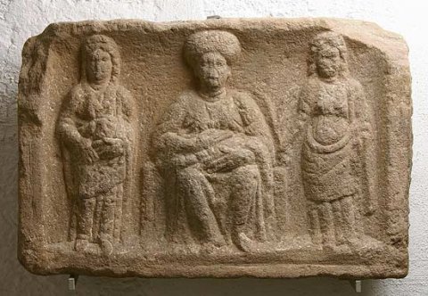 - Mythische Figuren: die drei Matronen sind mit langen Unter- und Obergewändern bekleidet. Die mittlere ist sitzend dargestellt und trägt zudem eine Haube. Während die rechte Figur Ähren und ein Szepter hält, ist bei der mittleren und linken Matrone je ein Früchtekorb erkennbar.