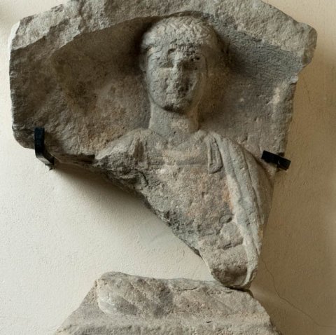 - Einheimische Frau: Halbfigur mit Umhang, Fibeln, Torques, Wickelkind.