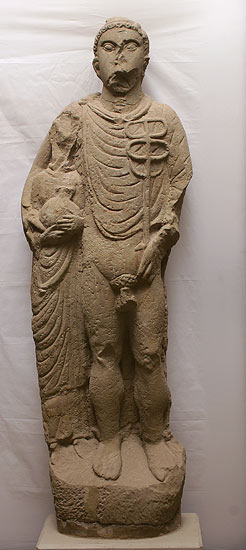 - Mythische Figur : Mercur mit Mäntelchen (Chlamys) bekleidet trägt auf dem Kopf den Flügelhut und hält in der Linken den Schlangenstab (caduceus). Den rechten Arm legt er schützend um die wesentlich kleiner wiedergegebene Göttin Rosmerta, die ein langes Gewand (Chiton) und darüber einen dreiviertellangen Mantel (Himation) trägt. Rosmerta hält in beiden Händen einen Beutel (mersupium).