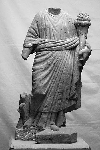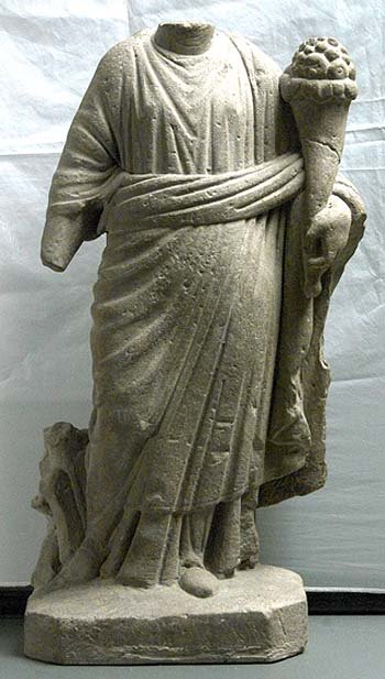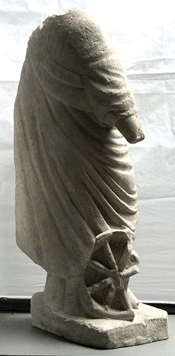 - Mythische Figur: Stehende Fortuna im langen Chiton und unter der Brust mit starkem Wulst über den linken Arm gezogenem Himation. Der Kopf und der rechte Unterarm sind abgeschlagen. Die rechte Hand hielt das Steuerruder, neben dem ein sechsspeichiges Rad angelehnt ist. Die linke Hand hält das Füllhorn. (Haug-Sixt²).