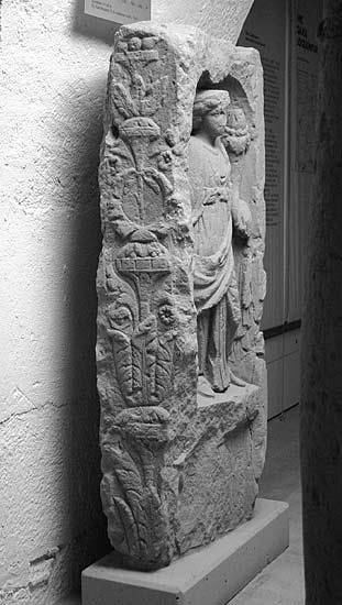 Mythische Figur: Fortuna steht frontal in einer Doppelnische mit muschelartigem Abschluß; die Zwickel links und rechts über den Bögen sind mit Akanthusblättern gefüllt. Die Göttin trägt ein Diadem im lockigen Haar. Bekleidet ist sie mit einer unter der Brust gegürteten langen Tunika und einem langen Mantel, der über die Schulter gelegt, unter ihrem linken Arm nach vorne geführt ist und auf ihrem rechten Arm liegt. In der Linken trägt sie ein Füllhorn, die Rechte stützt sie auf Steuerruder und Rad.