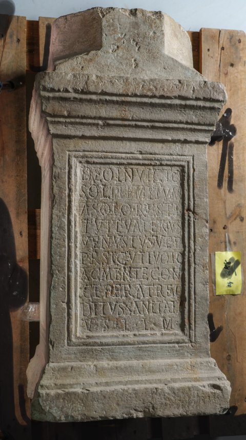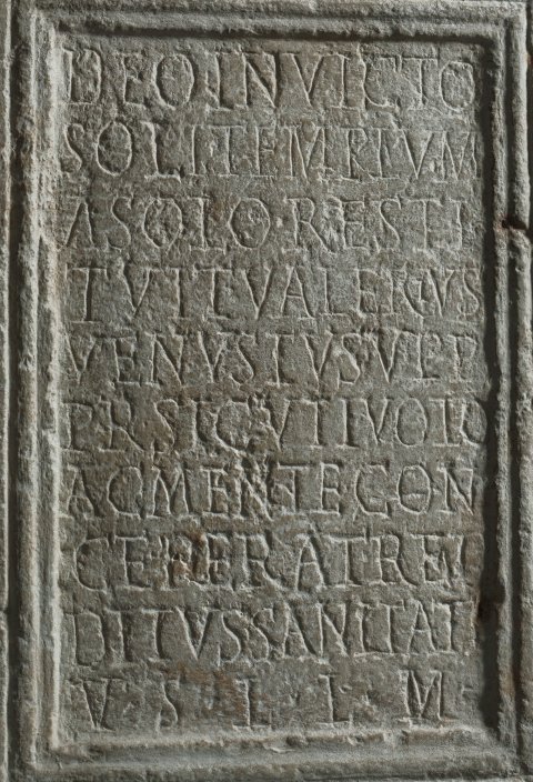- Deo Invicto / Soli templum / a solo resti/tuit Valerius / Venustus v(ir) p(erfectissimus) p(raeses) / p(rovinciae) R(aetiae) sicuti voto / ac mente con/ceperat red/ditus sanitati / v(otum) s(olvit) l(ibens) l(aetus) m(erito)