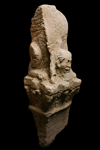 - Rest eines Pyramidenstumpf-Daches mit Kapitell, darauf hockende Sphinx über einem bärtigen Kopf.