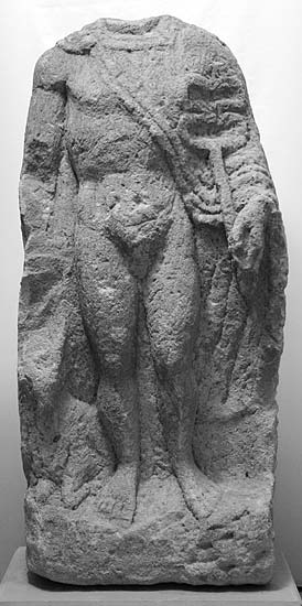 - Mythische Figur : Der stehende Mercur ist bekleidet mit einer Chlamys, in der Linken hält er den Caduceus. Zu seinen Füßen ist fragmentarisch ein Ziegenbock erkennbar.