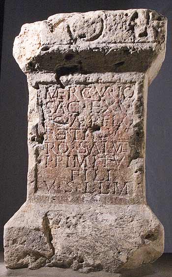 - Mercurio / sac(rum) ex voto / Ael(ius) Flo/rentinus / pro salute / Primitivi / fili(i) / v(otum) s(olvit) l(ibens) l(aetus) m(erito)