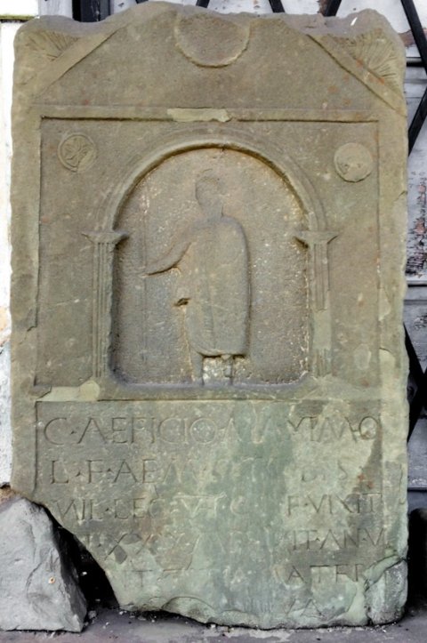 - C(aio) Aeficio Maximo / L(uci) f(ilio) Aem(ilia) Stobis / mil(iti) leg(ionis) VII C(laudiae) p(iae) f(idelis) vixit / [a]n(nos) XXV meruit an(nos) V / [pos]uit Titia mater / [et] sibi viva