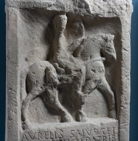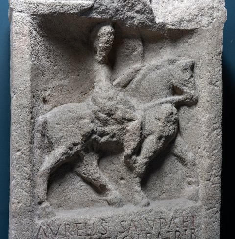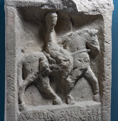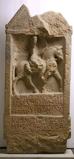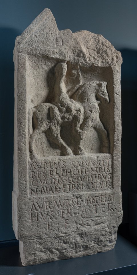 - Den Manen. Dem Aurelius Saluda und dem (Aurelius) Regrethus, seinen Brüdern, einst Reiter der "ala nova firma cataphractia" hat der Bruder Aurelius Aurelianus Abdethatus als Erbe den Grabstein machen lassen.