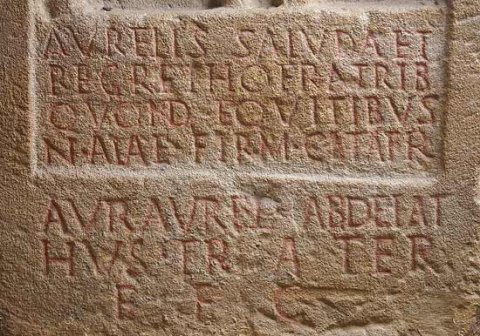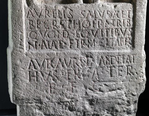 - D(is) M(anibus) // Aureli(i)s Saluda et / Regretho fratrib(us) / quond(am) equitibus / n(ovae) alae firm(ae) catafr(actariae) / {AUR} Aurel(ius) Abdetat/hus frater / e(orum) f(aciendum) c(uravit)