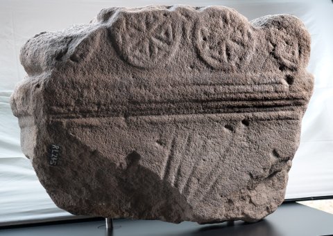 - Das Gesims ist mehrfach abgetreppt, darüber vier Rosetten auf der Stirnfläche von Voluten. Unterhalb des Gesimses keine Inschriftreste, nur sieben strahlenförmige Rinnen, offenbar vom Schleifen von Werkzeugen.