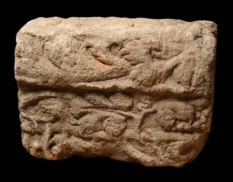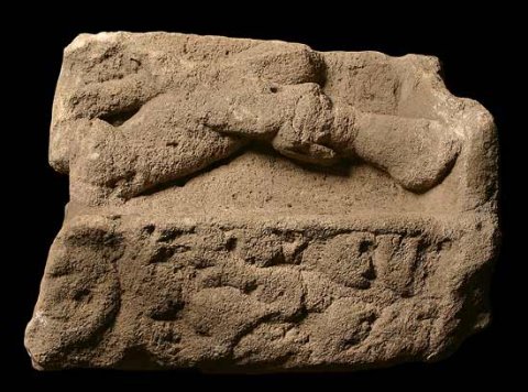 - Eckblock: auf der Vorderseite Nische, links von mit Blattornamenten verziertem Pilaster gerahmt. In der Nische zwei gekreuzte Beine (Attis ?). Pilaster auf der Schauseite 15 cm, auf der Nebenseite 14 cm breit. In der Nische der Nebenseite Weinranken.