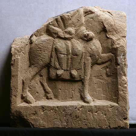 - Mythische Figur : Epona sitzt quer auf einem nach rechts gehenden Pferd mit langer Satteldecke. In der Rechten Schale.