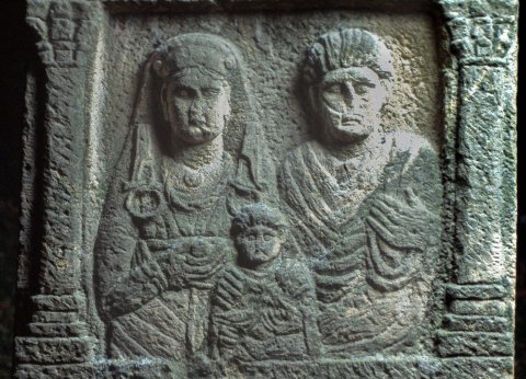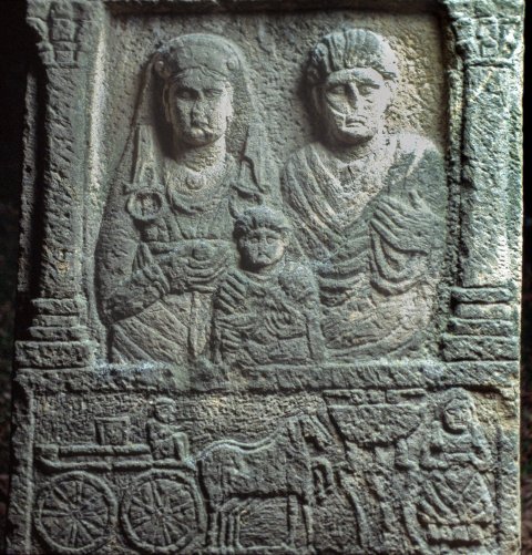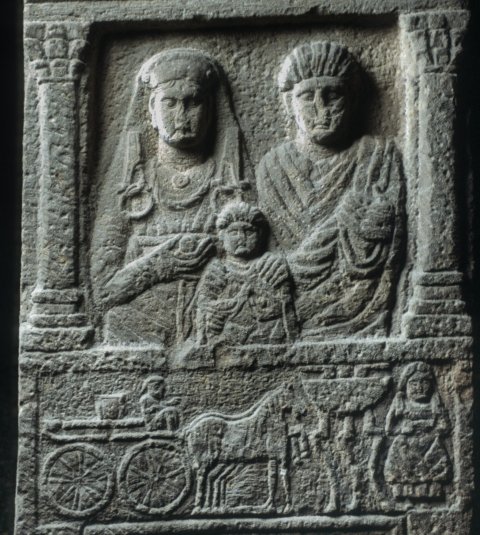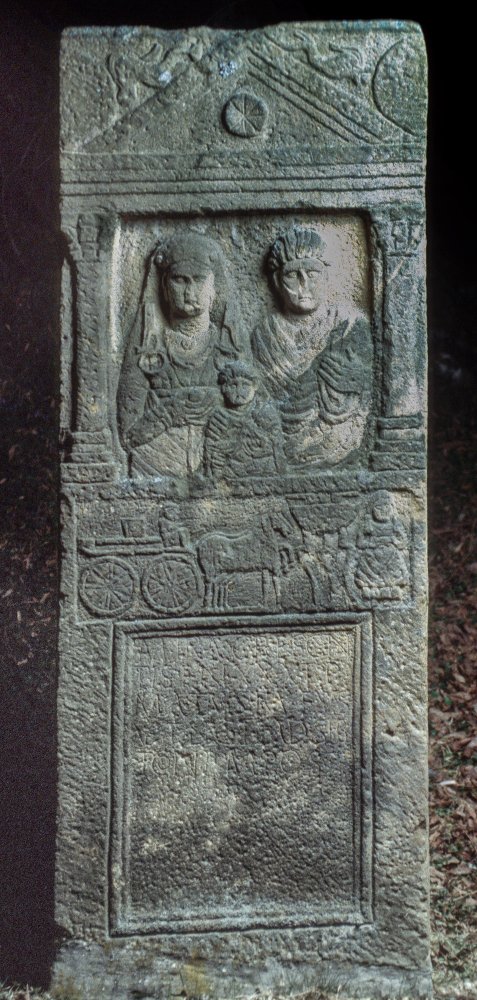 Im Hauptbild Familie: zwischen Säulen Halbfiguren eines Ehepaares mit Kind. Links einheimische Frau: Haube, Schleier, Ober und Untergewand, Gürtel, Flügelfibeln mit Ring, Torques, in der Rechten Apfel. Rechts Mann: bärtig, Toga. Vorn Knabe.