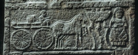 Im Zwischenbild Wagenszene, Totenopfer: links vierrädriger offener Wagen mit Kutscher und Zweigespann, rechts dreibeiniger Tisch mit Gefäßen, rechts davon Dienerin. - Inschrift