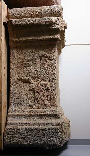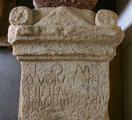- Der Stein hat Sockel und Bekrönung, an letzterer zwei Randwülste (pulvini), dazwischen ein Dreieck. Auf der Oberseite eine Vertiefung. Auf der linken Nebenseite ein Adler mit aufgehobenen Flügeln, der einen rundlichen Gegenstand (Kranz odr Ring) im Schnabel hält und auf einem Altar oder einer Säule steht. Auf der rechten Nebenseite die Opfergeräte Krug, Messer, Griffschale und Beil.