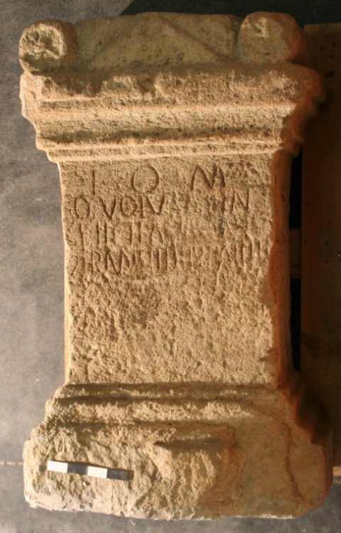 - I(ovi) O(ptimo) M(aximo) / Q(uintus) Volu[---]I(?)N / [------] / aram [-----] / [---