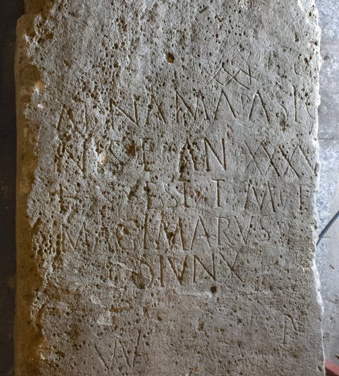 - Adnama Asio/nis f(ilia) an(norum) XXXV / h(ic) s(ita) est t(itulum) m(emoriae) p(osuit) / Magimarus / coiunx // Te amo / XXX // VV