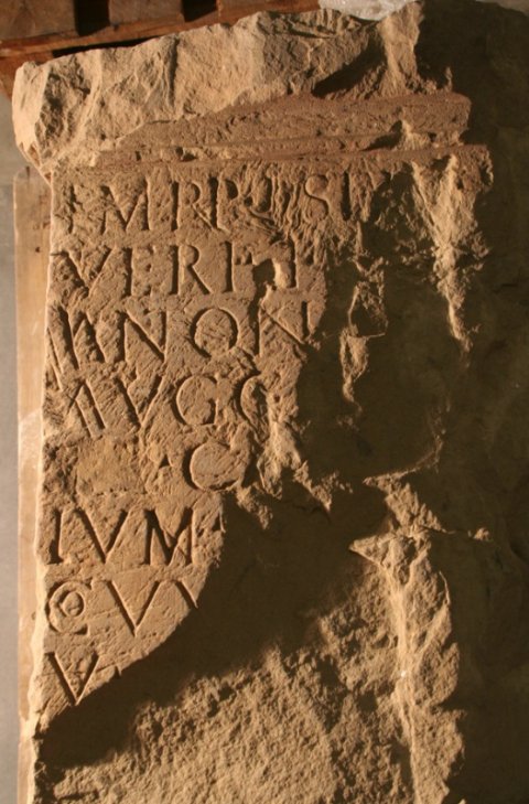 - Das Gesims war beschriftet und ist durch den Bagger stark zerstört, ebenso die rechte Hälfte der Inschrift