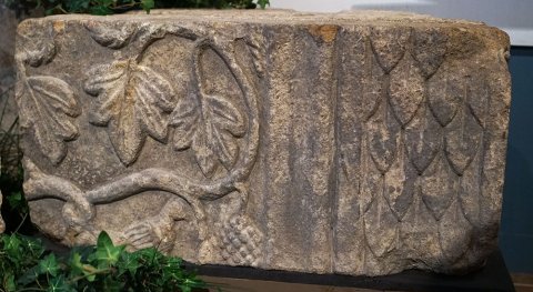 - Wandfragment mit Weinranken mit Vogel, rechts Pilaster mit Schuppendekor;