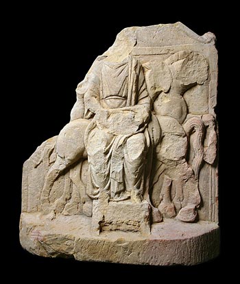 - Mythische Figur: thronende Epona in gegürtetem Gewand und Mantel, auf den Knien Schale. Hinter ihr zwei Pferde nach rechts, ein Pferd nach links.