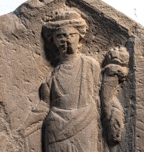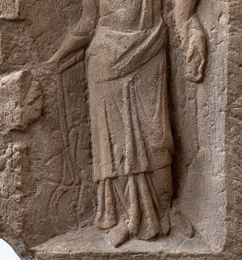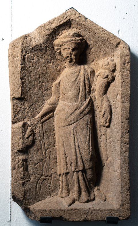 - Mythische Figur : einfach gerahmte Tafel mit Giebelabschluss. Fortuna in Chiton und Mantel, mit Diadem, Steuerruder in der Rechten, Füllhorn im linken Arm.