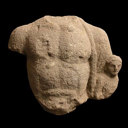 - Mythische Figur: nackter Oberkörper des Mercur, Mantel über der linken Schulter, im linken Arm Dionysoskind (Adorant ?).