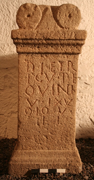 - Der Stein hat Sockel und Gesims, letzteres mit zwei Randwülsten (pulvini), dazwischen ein Dreieck. Die Inschrift ist entweder unvollendet geblieben oder wurde ganz vorgemalt, jedoch nicht fertig eingehauen.