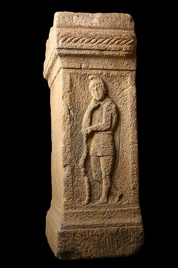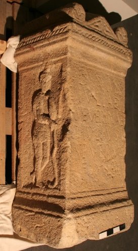 Mythische Figur. Der Grabstein hat die Form eines Altars mit Sockel und Gesims. Auf der Vorderseite des Gesimses zwei Randwülste (pulvini) mit Rosetten, dazwischen ein Dreieck, auf der Oberseite eine schwache Vertiefung mit erhöhtem Rand, quadratischem Loch in der Mitte und zwei schmalen Löchern auf den Seiten. Um das Gesims zieht sich ein schnurartiges Ornament. Die Nebenseiten sind mit Attisbildern verziert. Attis trägt enganliegende asiatische Tracht, darüber eine hinten herabfallende Chlamys; er stützt sich auf einen Bogen (Pedum ?).