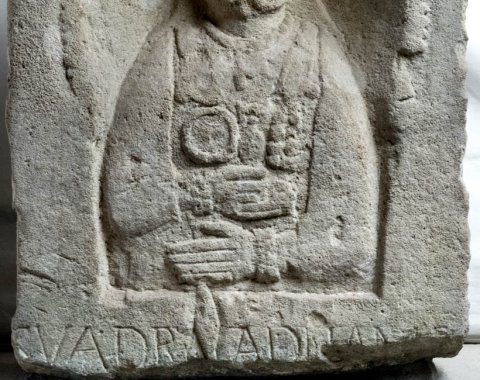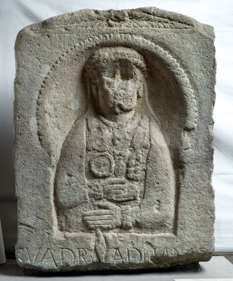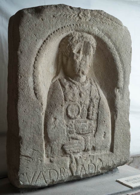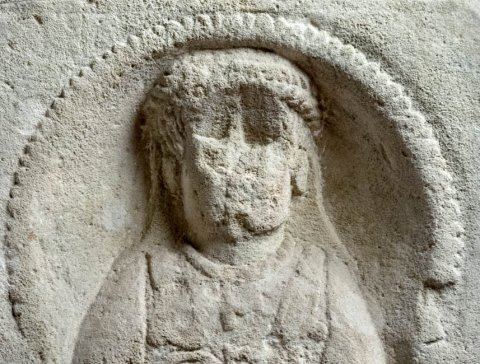- Einheimische Frau: in Bogennische Brustbild mit Haube, Schleier, Umhang, Fibeln mit Ring, Halskette, Kniefibel, Armreifen, in der Linken Spindel, in der Rechten Rocken (?). Bogen mit Zackenband gerahmt, darüber Rosette zwischen Blättern.