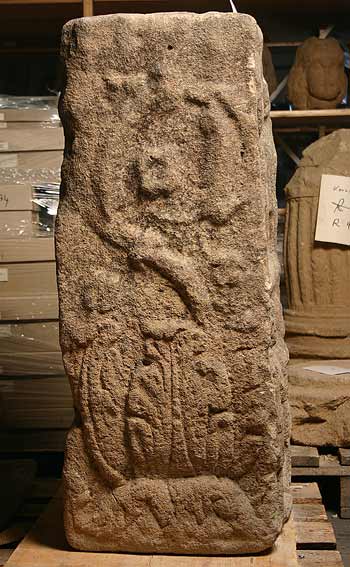 - Mythische Figur : Auf der Vorderseite weibliche Gottheit (Minerva mit Kopf der Gorgo Medusa ?), auf Nebenseiten Akanthusornament (auf einer Seite Fratze), auf der Rückseite zwei Relieffelder übereinander. Oben weibliche und männliche Figur nach links (Verfolgungsszene ?), unten zwei einen Korb tragenden Männer (Weinernte ?).