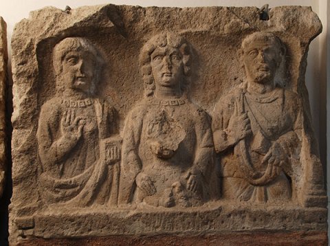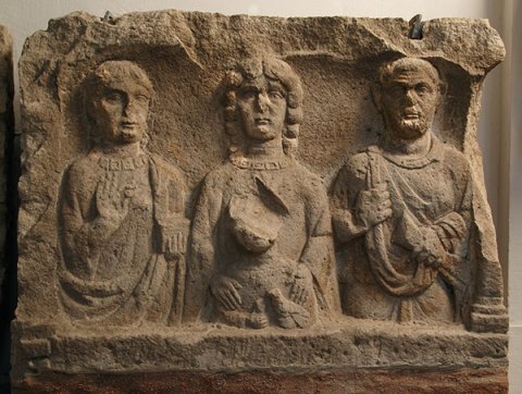 - Familie: zwischen Säulen Halbfiguren eines Ehepaares mit Tochter und Kleinkind. Mann: bärtig, Sagum mit Scheibenfibel, in der Linken Rolle (volumen). Frau: severische Melonenfrisur, Ärmeltunica, Halskette. Mädchen: langes Haar, Ärmeltunica, Mantel, Halskette, in der Linken Kästchen, in der erhobenen Rechten Münze. Kind: in der linken Hand Vogel.